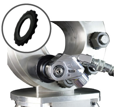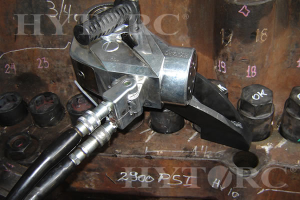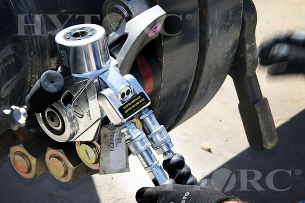 Seguridad, exactitud y manos libres; colocando la Arandela HYTORC bajo la tuerca hexagonal elimina la necesidad de brazos de reacción y llaves de respaldo